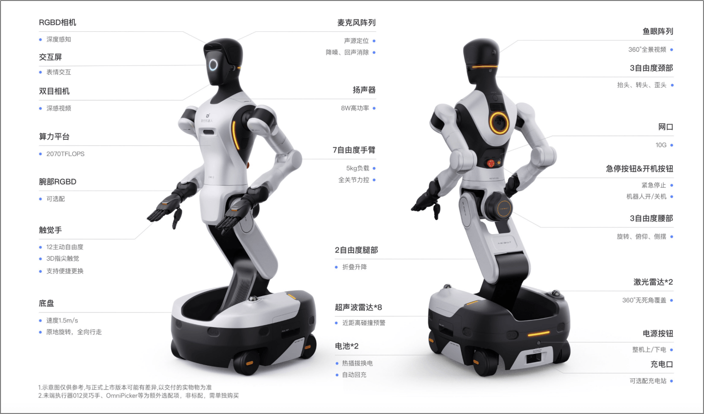 2)腰部布局同样送来严沉升级:G1仅具备单一度的起落俯仰功能,G2则扩展至三个度,支撑平面扭转、前后哈腰取摆布摆动。这不只加强了机械人的矫捷性——例如无需动弹底盘即可通过快速转腰操做两侧货架,还扩大了其工做空间,正在导览或取物时可通过腰部摆动延长触及范畴。别的,下肢采用可折叠构型,使零件布局更为紧凑,便于运输取包拆。