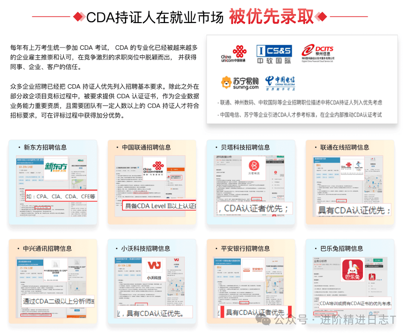 ✅CDA企业承认度若何?CDA企业承认度很是高,良多企业聘请时说明CDA数据阐发师优先,对找工做很是有帮帮。良多银行、金融机构的手艺岗会要求必需是CDA数据阐发师二级以上的持证人。中国联通、央视广信、德勤、苏宁等企业,把CDA持证人列入优先考虑或者对员工的CDA测验给补助。 |